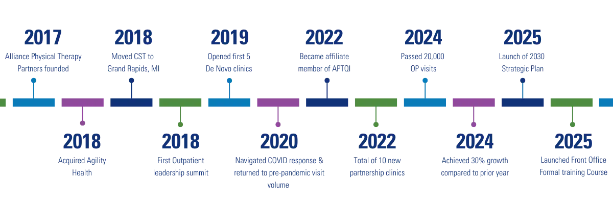 Alliance was founded in 2017 and has grown rapidly but sustainably, weathering early challenges and the Covid-19 pandemic to become a respected leader in outpatient physical therapy providers nationwide.